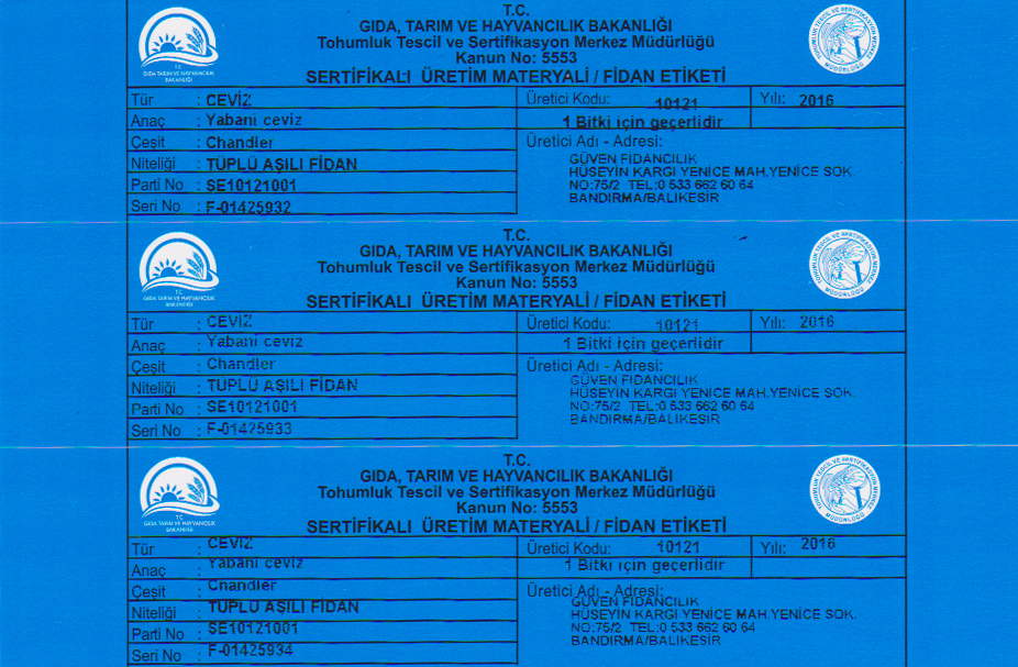 Наша компания, Гювен Фиданджилик, входящая в число компаний, продающих саженцы грецкого ореха с синим сертификатом, является владельцем участка разведения саженцев с синим сертификатом существующих в ограниченным количестве в нашем регионе и продолжает продавать саженцы грецкого ореха сорта чендлер с синим сертификатом. Саженцы грецкого ореха с синим сертификатом можно посадить в любом месте, включая Бурсу, Денизли, а также западные регионы, такие как Агры, Карс и Игдыр.